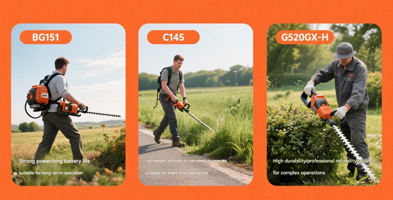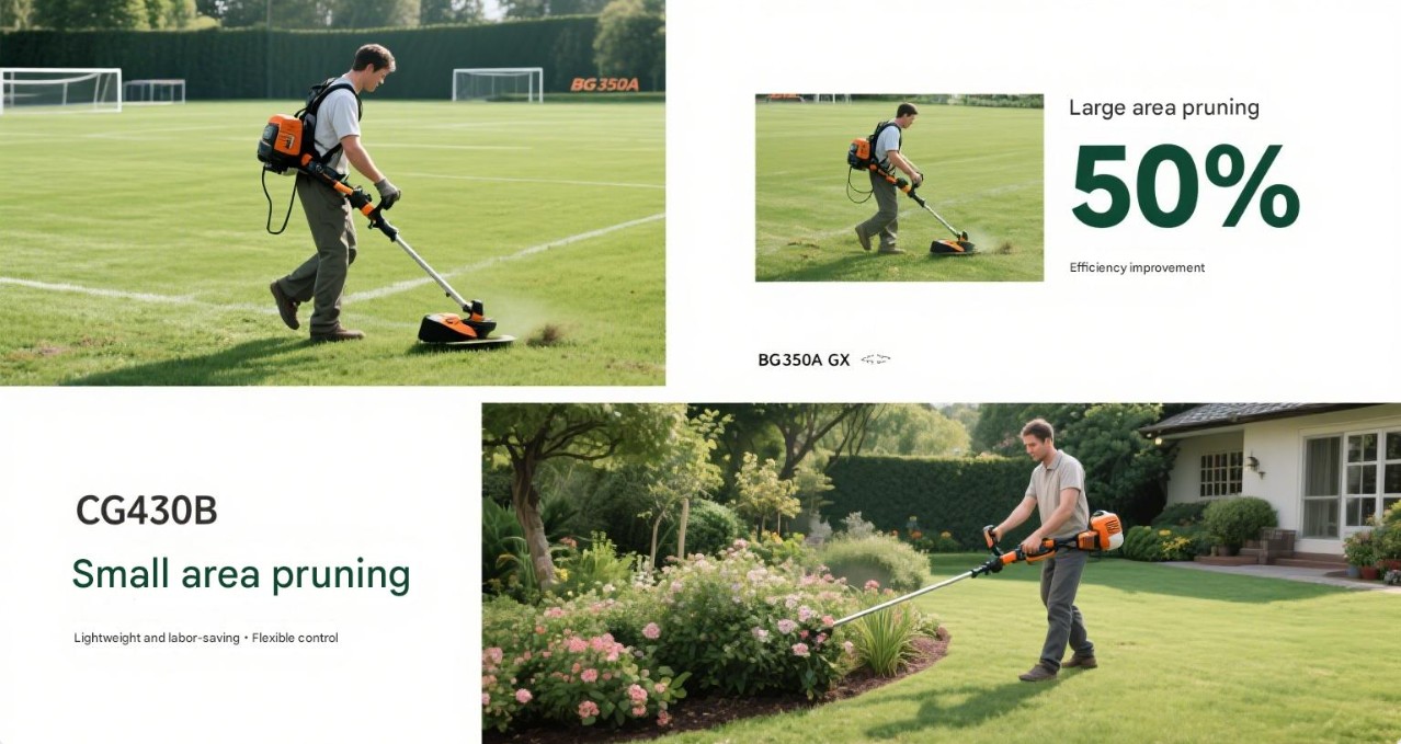 Klippning av små ytor: För små trädgårdar och ogräs vid vägkanten kan du välja en handhållen gräsklippare, som CG145 röjsax och borstklippare CG430B. Dessa modeller är lätta och lätta att bära, lätta att använda, lämpade för korttidsoperationer och klarar enkelt klippbehovet på små ytor.