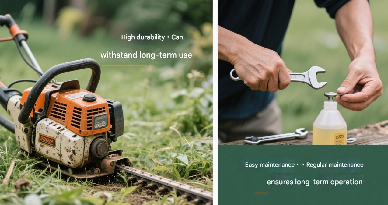 Enkelt underhåll: Bensin röjskärare är lätt att underhålla. Regelbundet enkelt underhåll och skötsel kan hålla den i gott skick och förlänga dess livslängd.