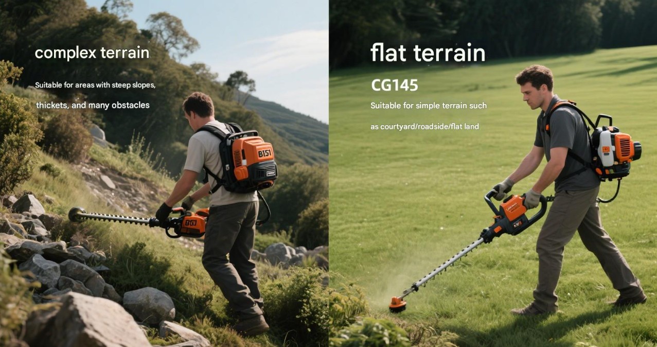 Plan terrängoperationer: När du klipper i plan terräng kan du välja en handhållen gräsklippare, som CG145 Busrycutter och Brush Cutte CG430B. Dessa modeller är lätta att använda och kan effektivt utföra klippningsuppgifter i plan terräng.
