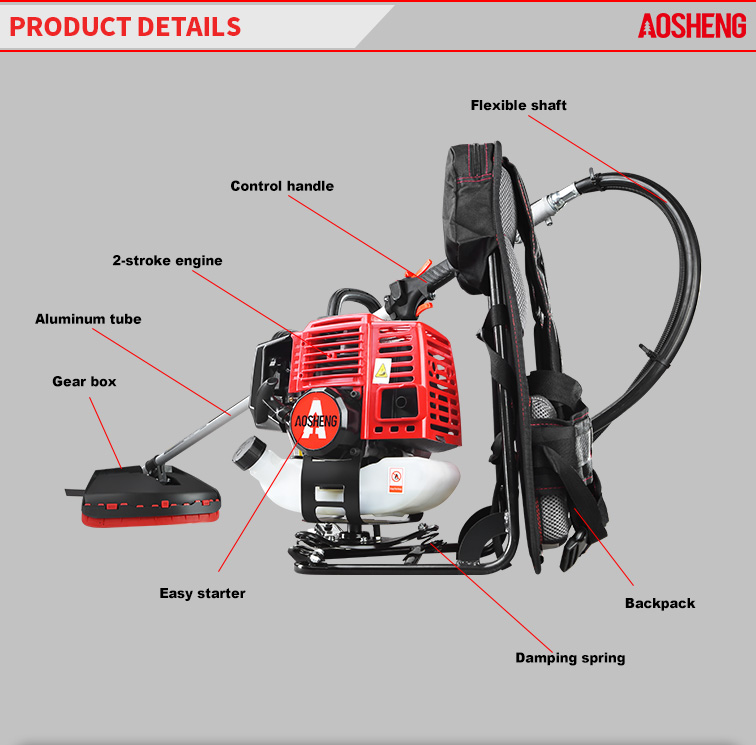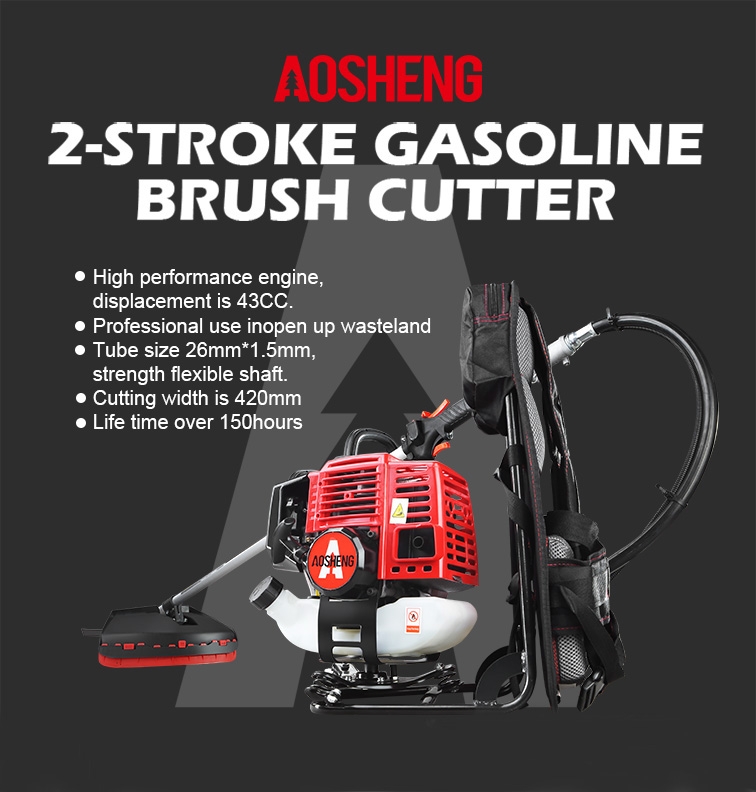 Högpresterande motor, slagvolymen är 33CC. Professionell användning öppnar ödemark Rörstorlek 26mm*1,5mm, styrka flexibelt skaft. Klippbredden är 420 mm Livstid över 150 timmar