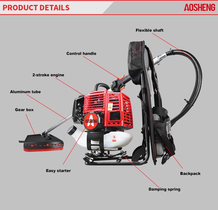 Högpresterande motor, slagvolymen är 33CC. Professionell användning öppnar ödemark Rörstorlek 26mm*1,5mm, styrka flexibelt skaft. Klippbredden är 420 mm Livstid över 150 timmar