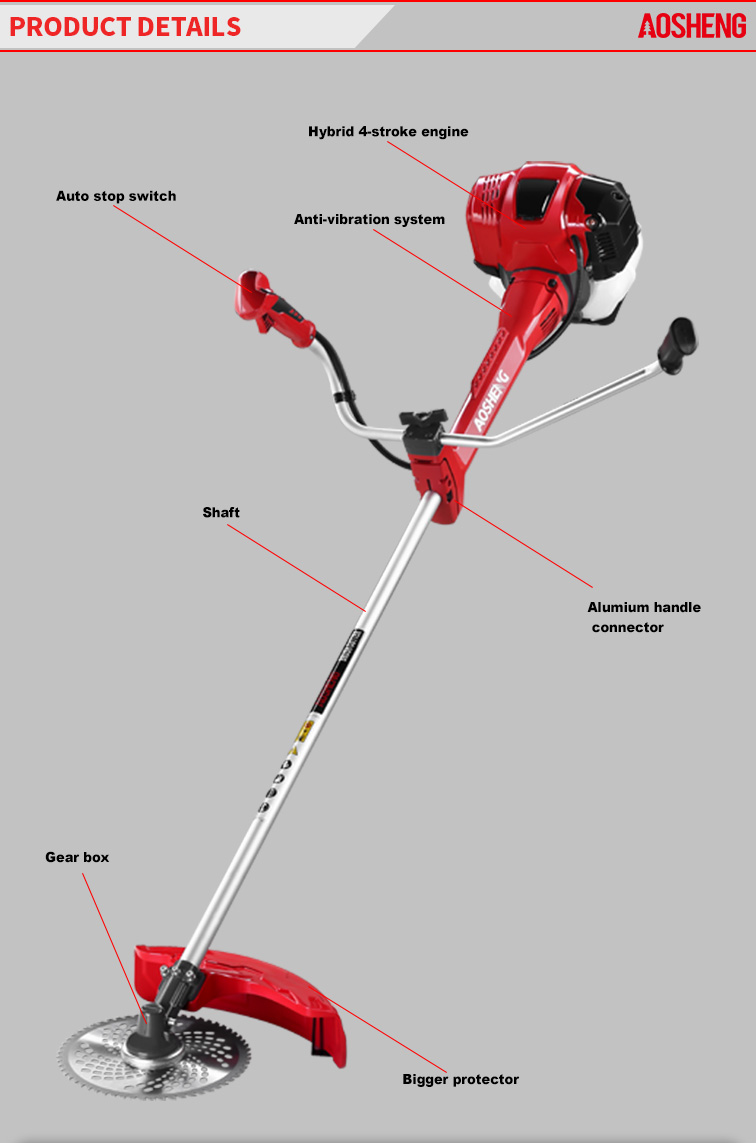 Högpresterande 4-taktsmotor, slagvolymen är 38CC. Professionell användning i den öppna ödemarken Rörstorlek 26mm*1,5mm, styrka flexibelt skaft. Klippbredden är 420 mm Livstid över 150 timm...