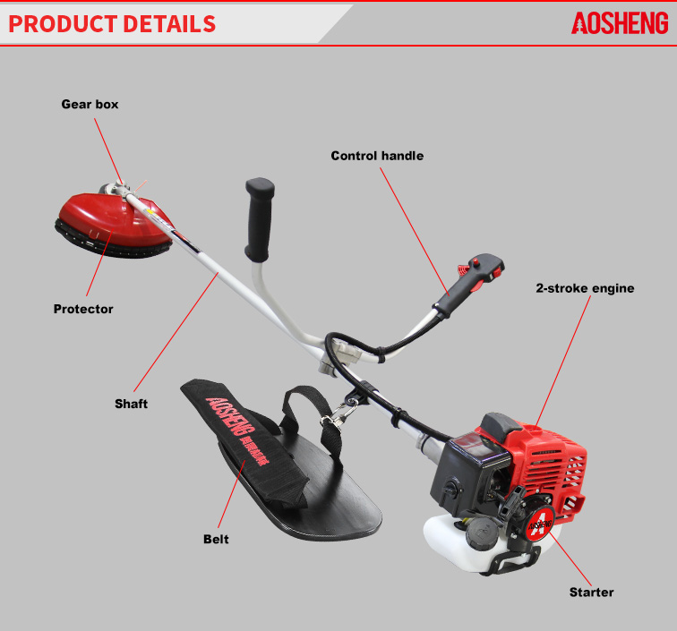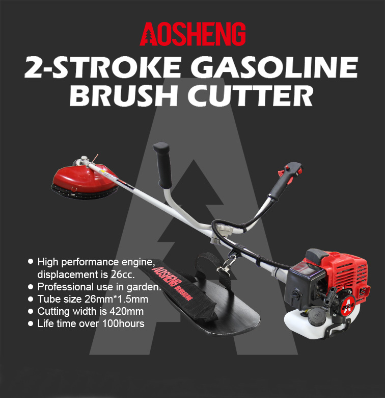 Högpresterande motor, slagvolymen är 33CC. Professionell användning öppnar ödemark Rörstorlek 26mm*1,5mm, styrka flexibelt skaft. Klippbredden är 420 mm Livstid över 150 timmar
