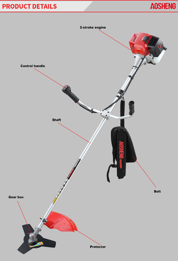 Högpresterande motor, slagvolymen är 33CC. Professionell användning öppnar ödemark Rörstorlek 26mm*1,5mm, styrka flexibelt skaft. Klippbredden är 420 mm Livstid över 150 timmar