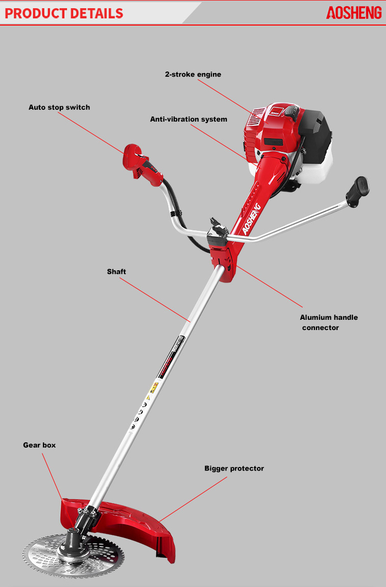 Högpresterande motor, slagvolymen är 33CC. Professionell användning öppnar ödemark Rörstorlek 26mm*1,5mm, styrka flexibelt skaft. Klippbredden är 420 mm Livstid över 150 timmar